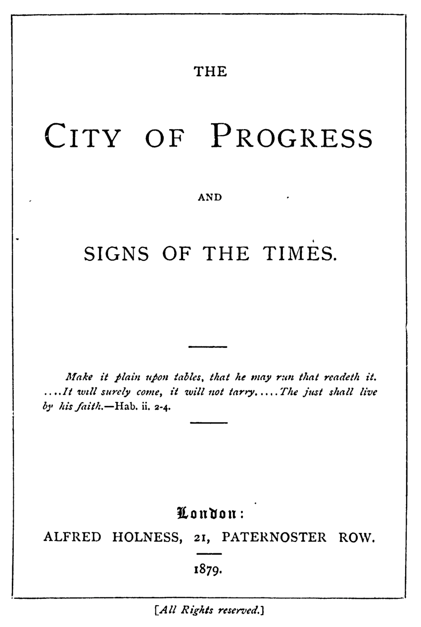 From The Bible Treasury, 1879, volume 12: "Allegory, etc., have been consecrated by the Highest and this when walking here among men, to the purposes of grace and truth: by His servants, too, though seldom with marked success. John Bunyan was a rare exception; and, spite of mistake and defect, his book retains its hold on the affections of thousands of saints, and commands the interest of innumerable young people, from generation to generation. The work now introduced to the acquaintance of the reader is in no way an imitation of its popular predecessor. It seeks, under a similar form, to guard from the prevalent snares of the day, but withal presenting, in a suggestive method, the main outlines of revealed truth, from the sin and sorrow of a lost paradise to the last judgment, and the making of all things new, when God shall be all in all in everlasting rest and glory. The book supposes a certain acquaintance with the workings of unbelief at this time, no less than of the Bible; but to all persons of exercised mind there is a fund of interesting and profitable thought. Hence it may be commended as very suitable for souls without as well as within."