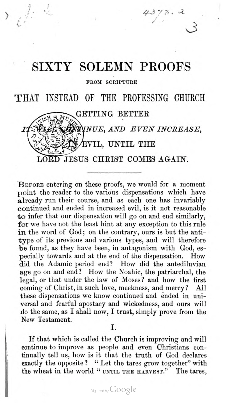 Sixty Solemn Proofs from Scripture that instead of the professing Church getting better it will continue, and even increase, in evil, until the Lord Jesus Christ comes again.