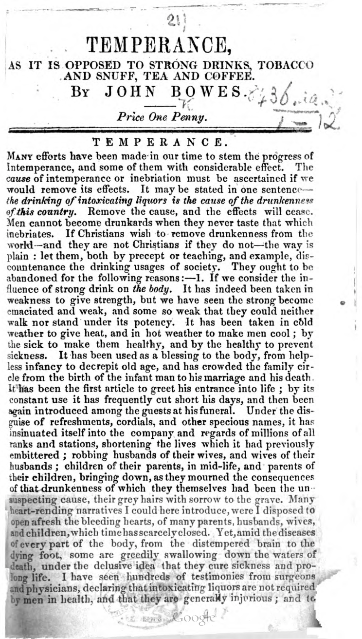 Temperance as it is opposed to Strong Drinks, Tobacco, and Snuff, Tea and Coffee