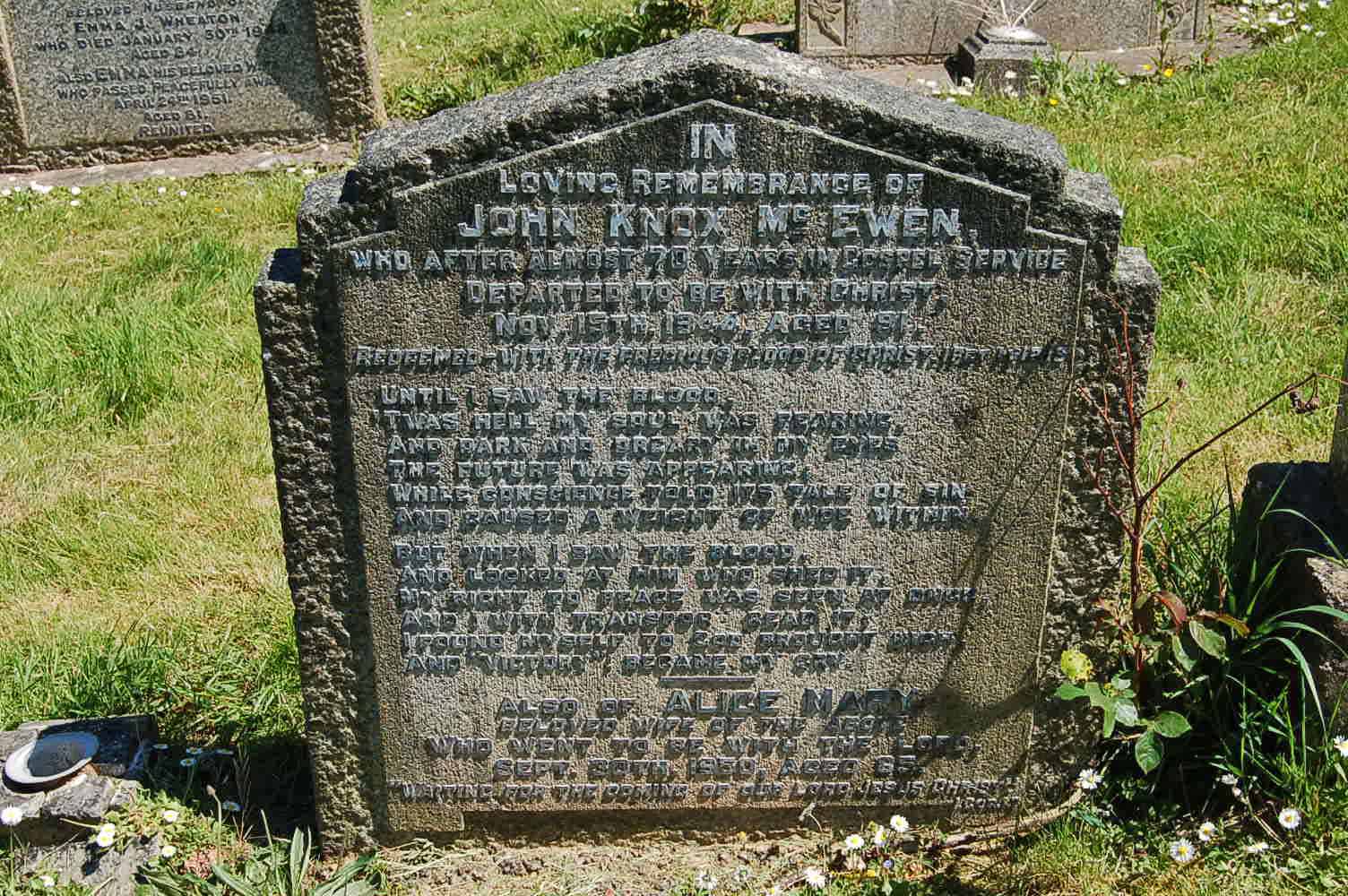 With the Lord: JOHN KNOX McEWEN John Knox McEwen, Exeter, England, age 92, passed on to his reward on November 15, 1944. A true pioneer and preacher of the gospel whose faithful service was honored by the Lord. He was active throughout his long life and will be remembered by many for his labors in Nova Scotia, Canada and in various parts of the United States. "Letters of Interest" 1945