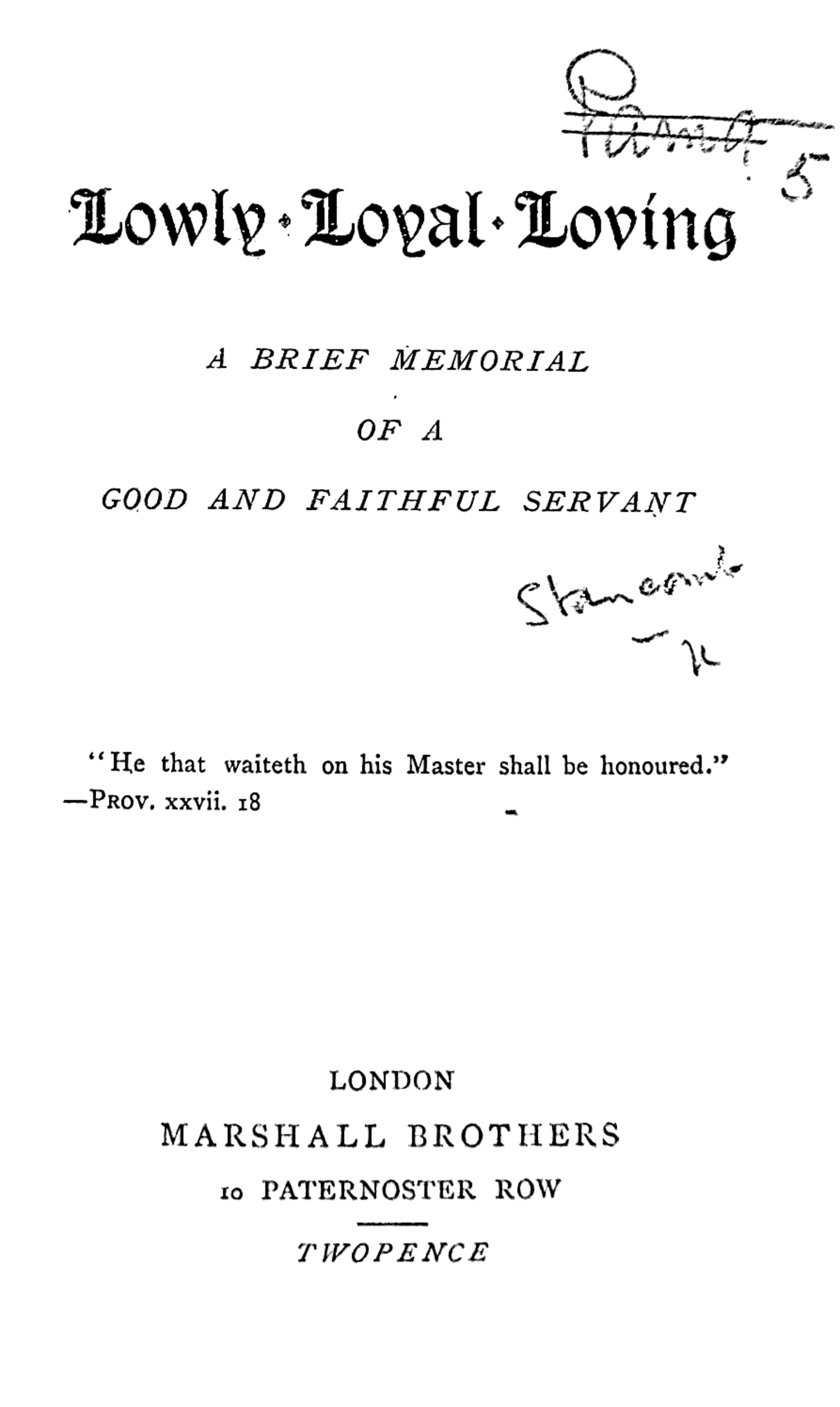Lowly, Loyal, Loving. A Brief Memorial of a Good and Faithful Servant