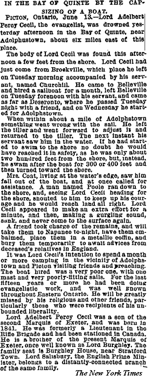 KINGSTON, June 13, 1889 – Lord Adelbert Perry Cecil, the evangelist, was drowned on Wednesday afternoon in the Bay of Quinte, near Adolphustown, about six miles east of Picton Ont., while sailing in company with Mr. Churchill from Belleville to Adolphustown with camp supplies.