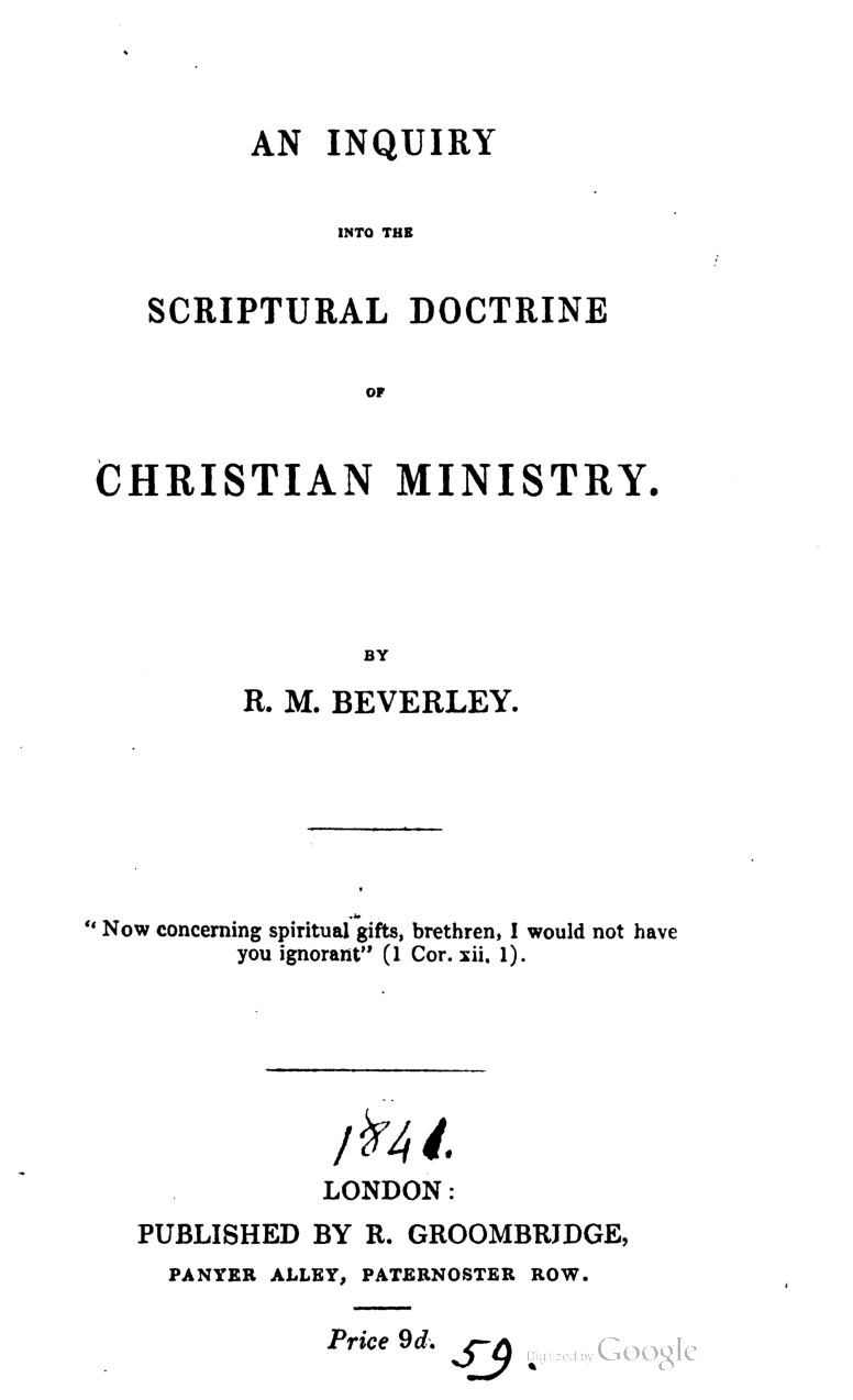 Not a great quality scan. This was also published by the Brethren publishing house at 1 Warrick Square. In the J.K.Campbell catalog of 1853 on site, it is titled "Doctrine (Scriptural) of Christian Ministry, by R. M. Beverley, second edition, 6d., cloth Is. "