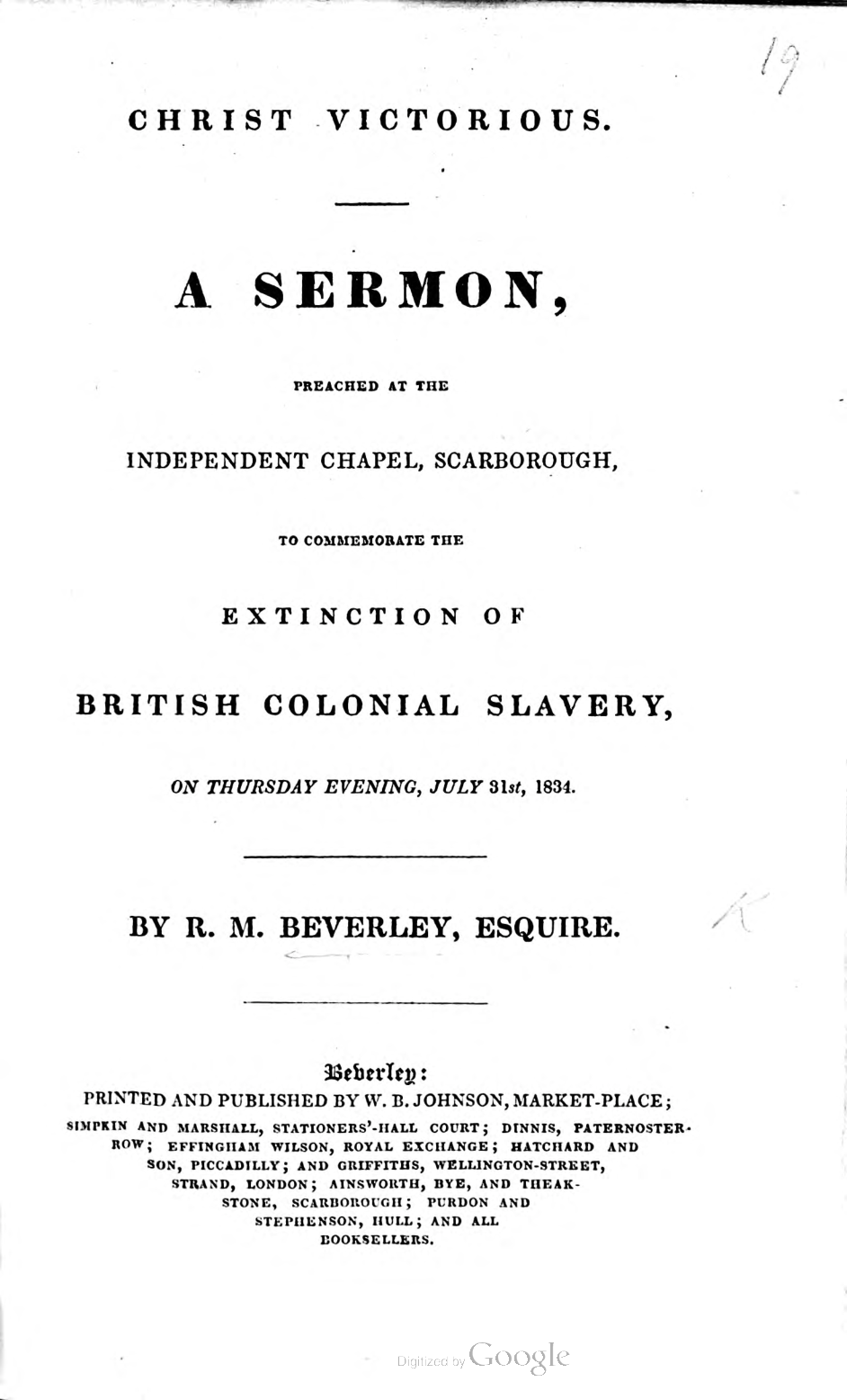 Christ Victorious. A Sermon, Preached at the Independent Chapel, Scarborough, to Commemorate the Extinction of British Colonial Slavery