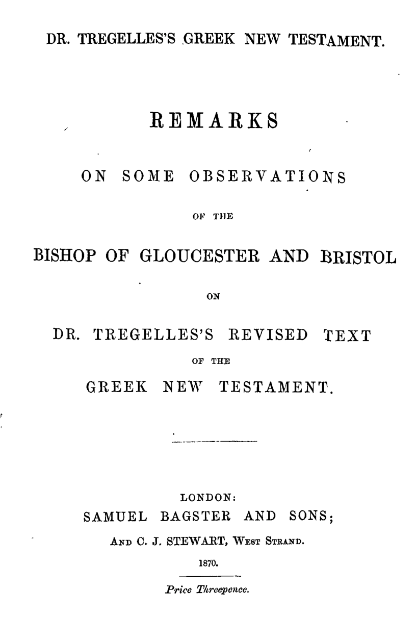 Although this is a defence of the textual principles of Tregelles, it is almost certainly the work of Benjamin Wills Newton, who oversaw the publication of the last parts of Tregelles's Greek New Testament — a task for which he was uniquely qualified as Tregelles had conversed and corresponded with him at great length throughout the thirty years of his project. Timothy Stunt