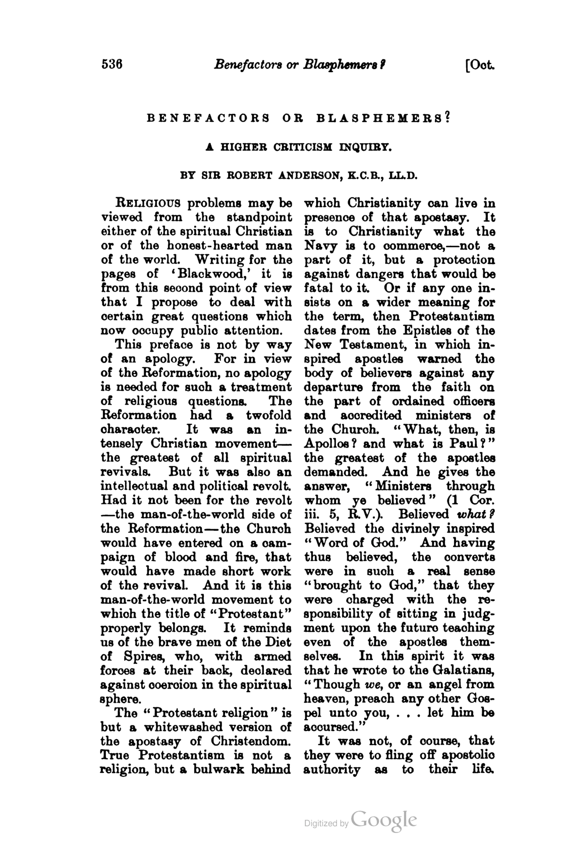 Benefactors or Blasphemers? A Higher Criticism Inquiry. (Blackwood's Magazine)