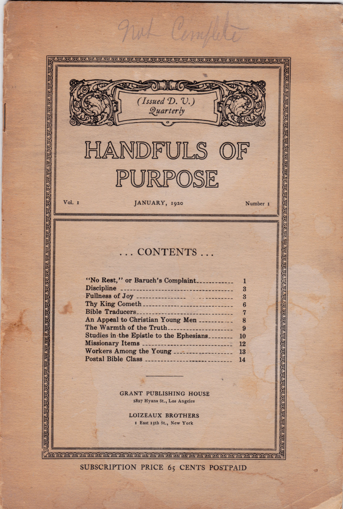 The editor of Handfuls of Purpose is John William Hugh Nichols, born on 23rd December 1867 in Cheltenham, England, son of John W. and Elizabeth Nichols. He died on 16th June 1960 in Redwood City, San Mateo, California, USA, and is buried in Alta Mesa Memorial Park in Palo Alta, Santa Clara County, California. J.W.H. Nichols came to the USA after 1891. He was married to Elizabeth Jones (1873–1961), also a native of England. They had 8 children, 11 grandchildren, and 2 great-grandchildren. J.W.H. Nichols is the brother of Edward Ernest Nichols (1865–1952).